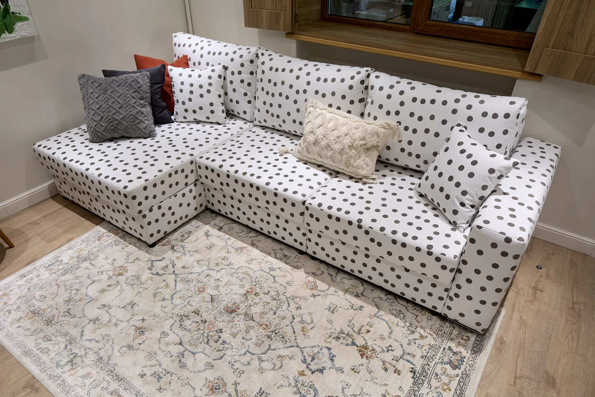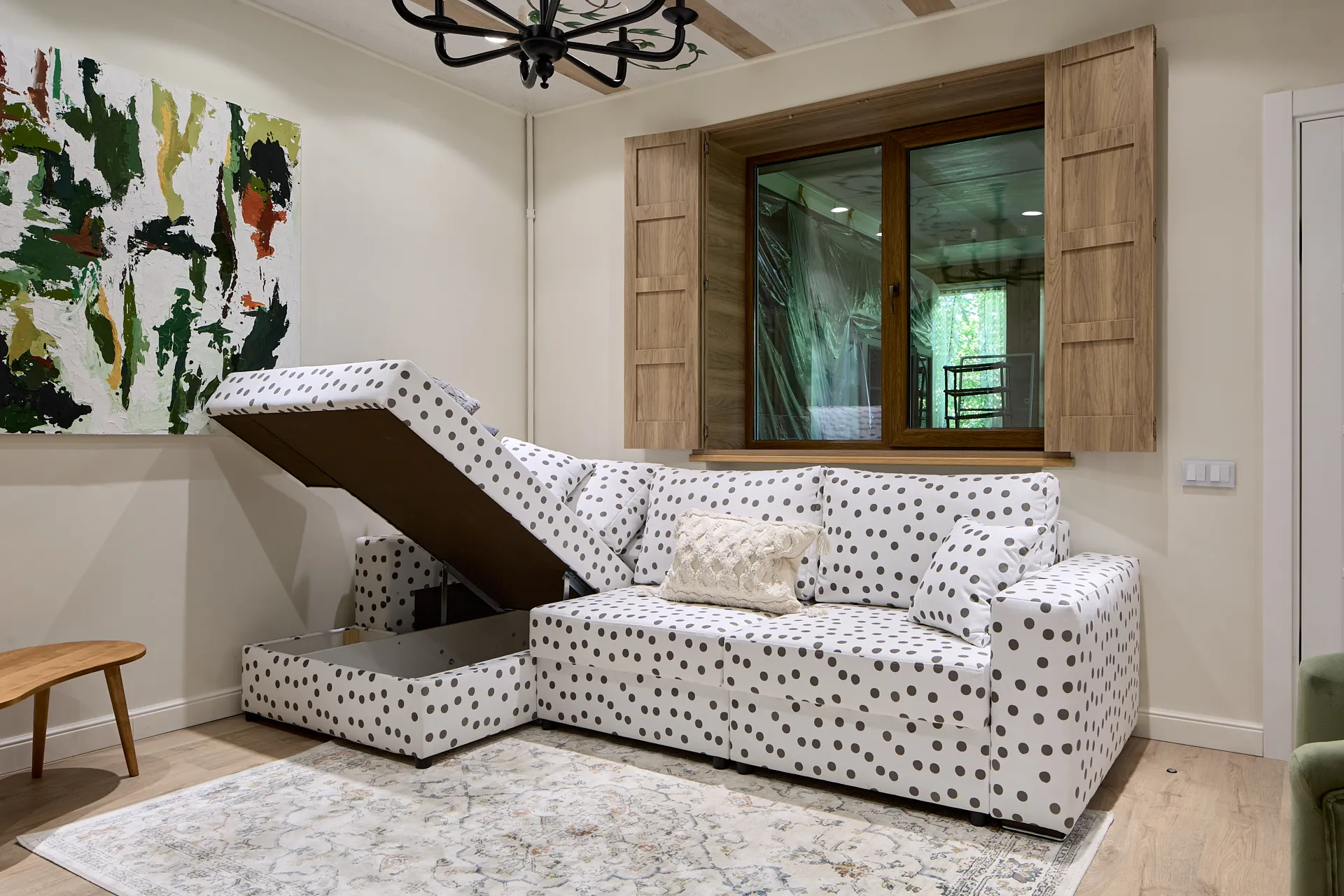 Обновление гостиной стало для героев приятным подарком, который им решила сделать сестра Дмитрия. Источником вдохновения при создании интерьера стали кованые цветы, которые украшают решетку камина героев передачи. И важной частью гостиной, естественно, стал удобный диван в обивке в горошек, как элемент деревенского стиля в современном загородном пространстве.