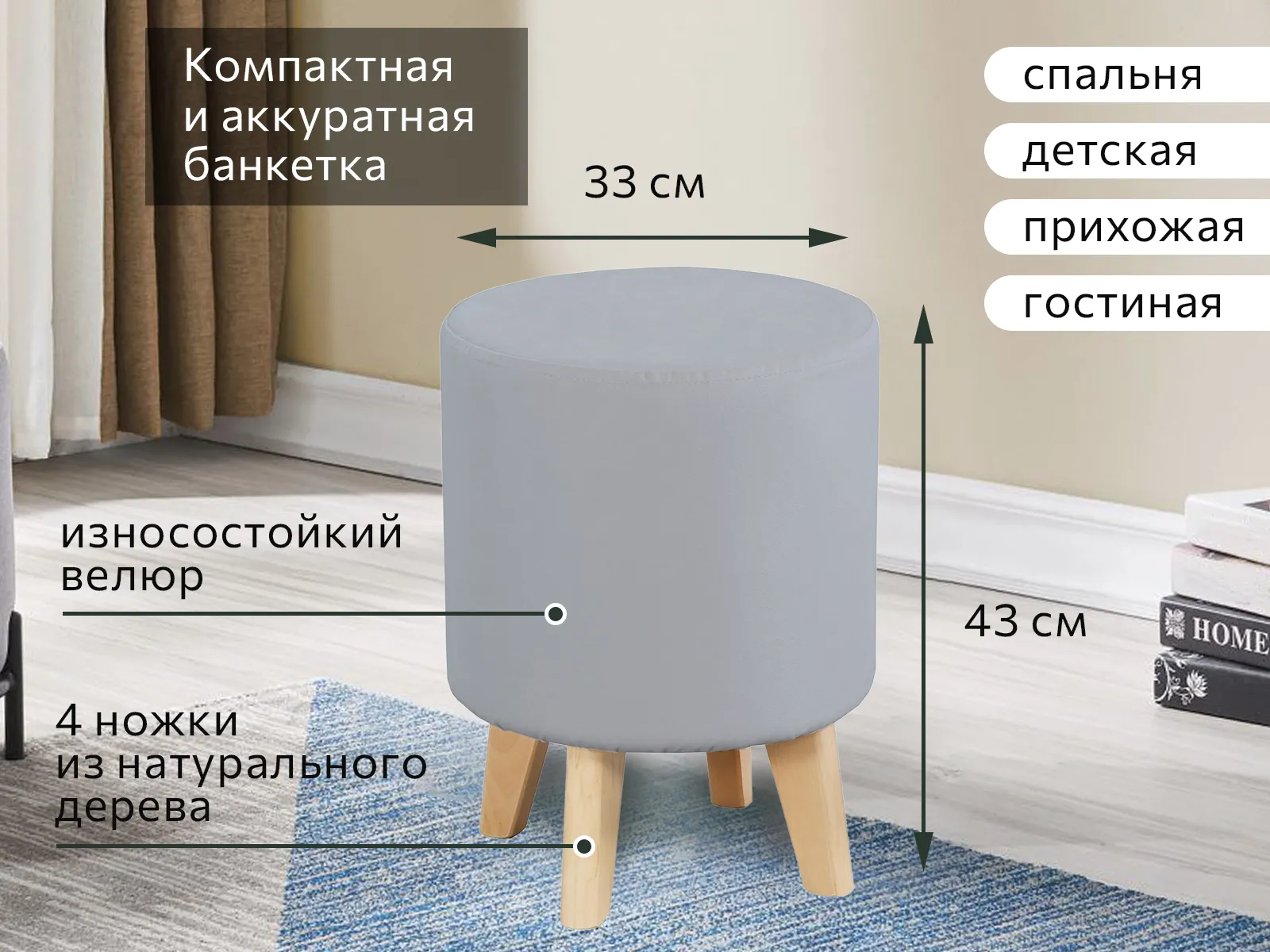 Круглая банкетка на ножках - это удобный и стильный предмет мебели, который может быть использован как место для сидения или как прикроватный пуфик. Она выполнена из ткани, что позволяет ей быть мягкой и удобной для сидения.