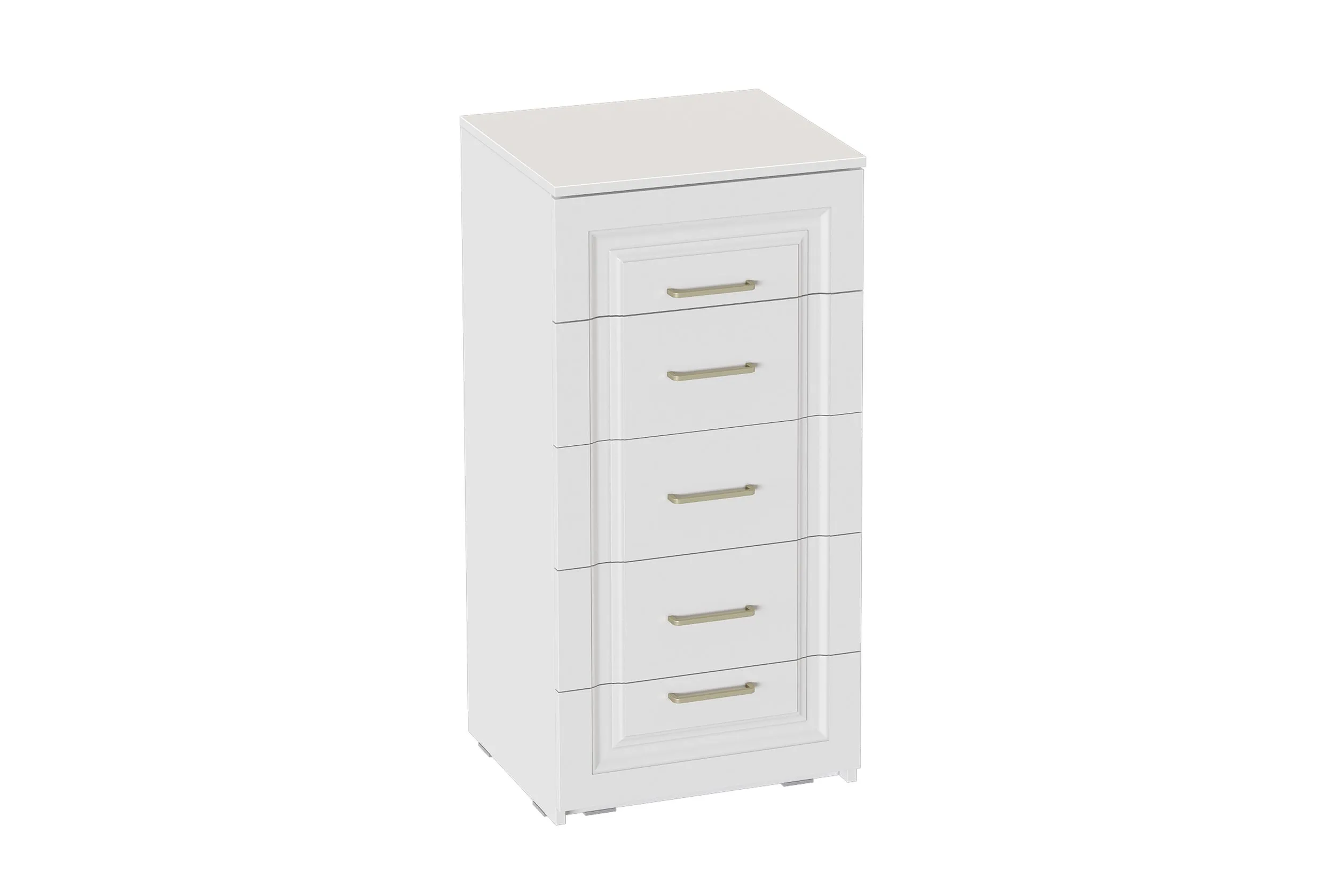 Комод выполнен в цвете Айс 06 / Белый Аляска. Классическая фрезеровка фасадов и ручки-скобы из брашированного золота придают изделию особый шарм и элегантность. Ящики полного выдвижения на шариковых направляющих скользят бесшумно и плавно. Дно и задние стенки выполнены из ХДФ. На опорах размещены войлочные подпятники.