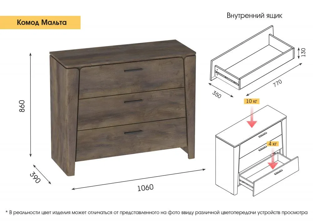 Вместительность комода обеспечивает три выдвижных ящика, которые идеально подходят для хранения одежды, постельного белья и других личных вещей. Каждый ящик оборудован шариковыми направляющими, обеспечивающими плавный и бесшумный ход при использовании. Благодаря этому, вы сможете быстро и без лишних усилий найти нужную вещь и так же легко вернуть ящик на место.