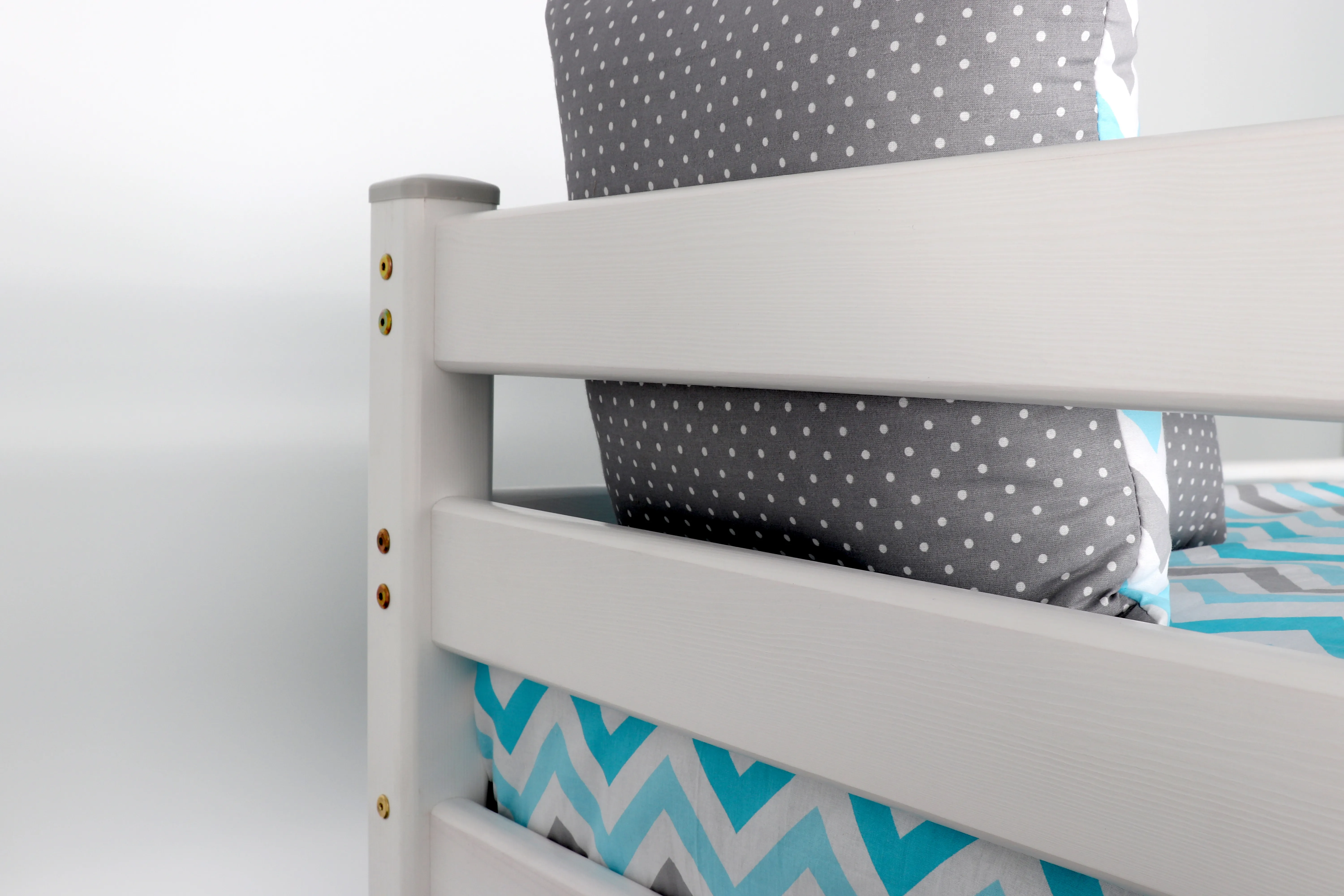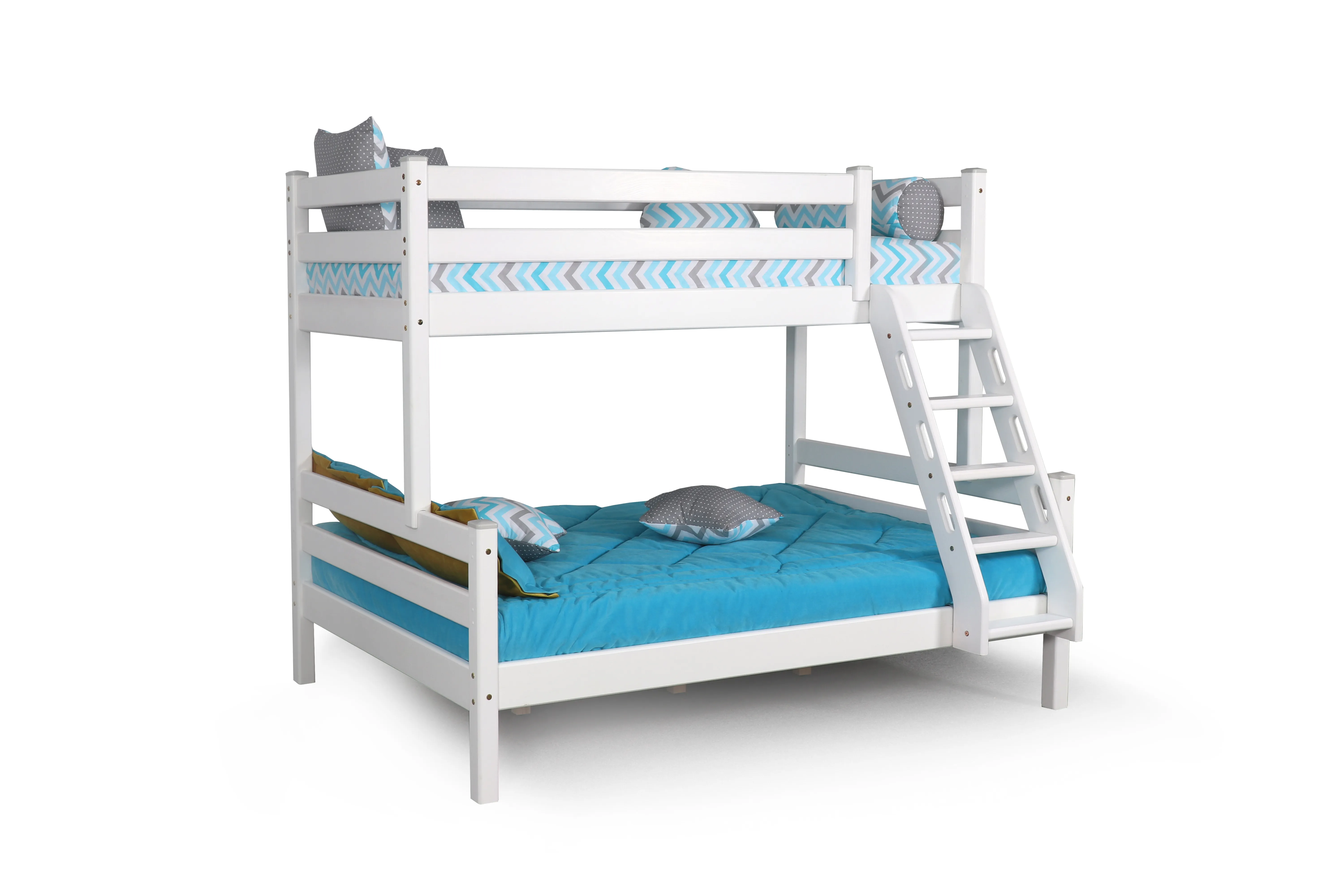 Увеличенное до 120 см по ширине спальное место нижнего яруса подходит для подростка, чей вес не превышает 70 кг. Верхнее основание имеет вид гнутых ламелей, с усиливающей перемычкой по периметру, нижнее представлено опорными брусками с уложенным поверх них настилом из шлифованного МДФ 10мм. Массив сосны подвергнут тщательной шлифовке и покрыт безопасным лаком на водной основе.
