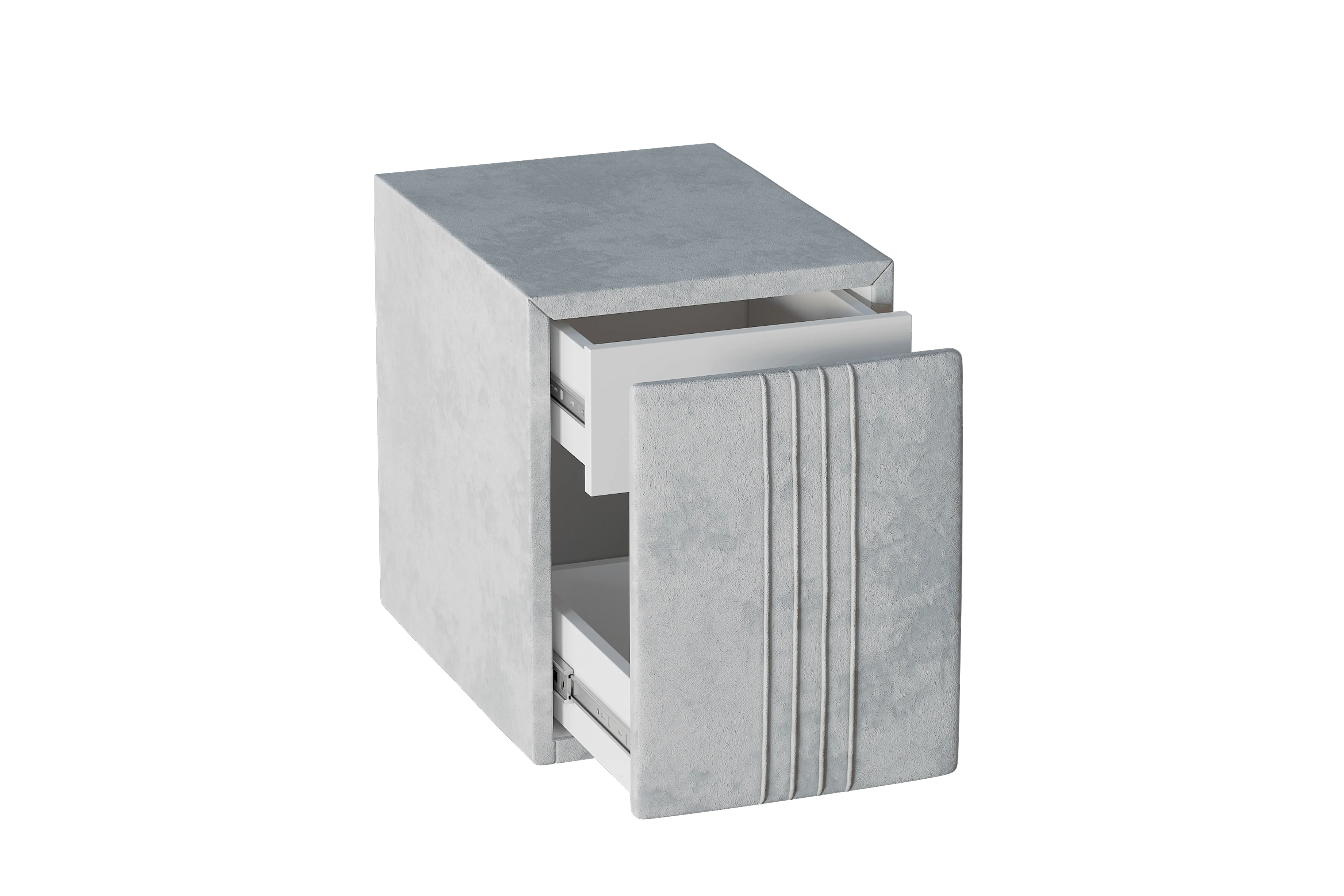 Тумба обтянута высококачественным велюром, имеет два вместительных выдвижных ящика с механизмом push to open. Скругленные торцы модели, минимизируют риск удариться в темноте.