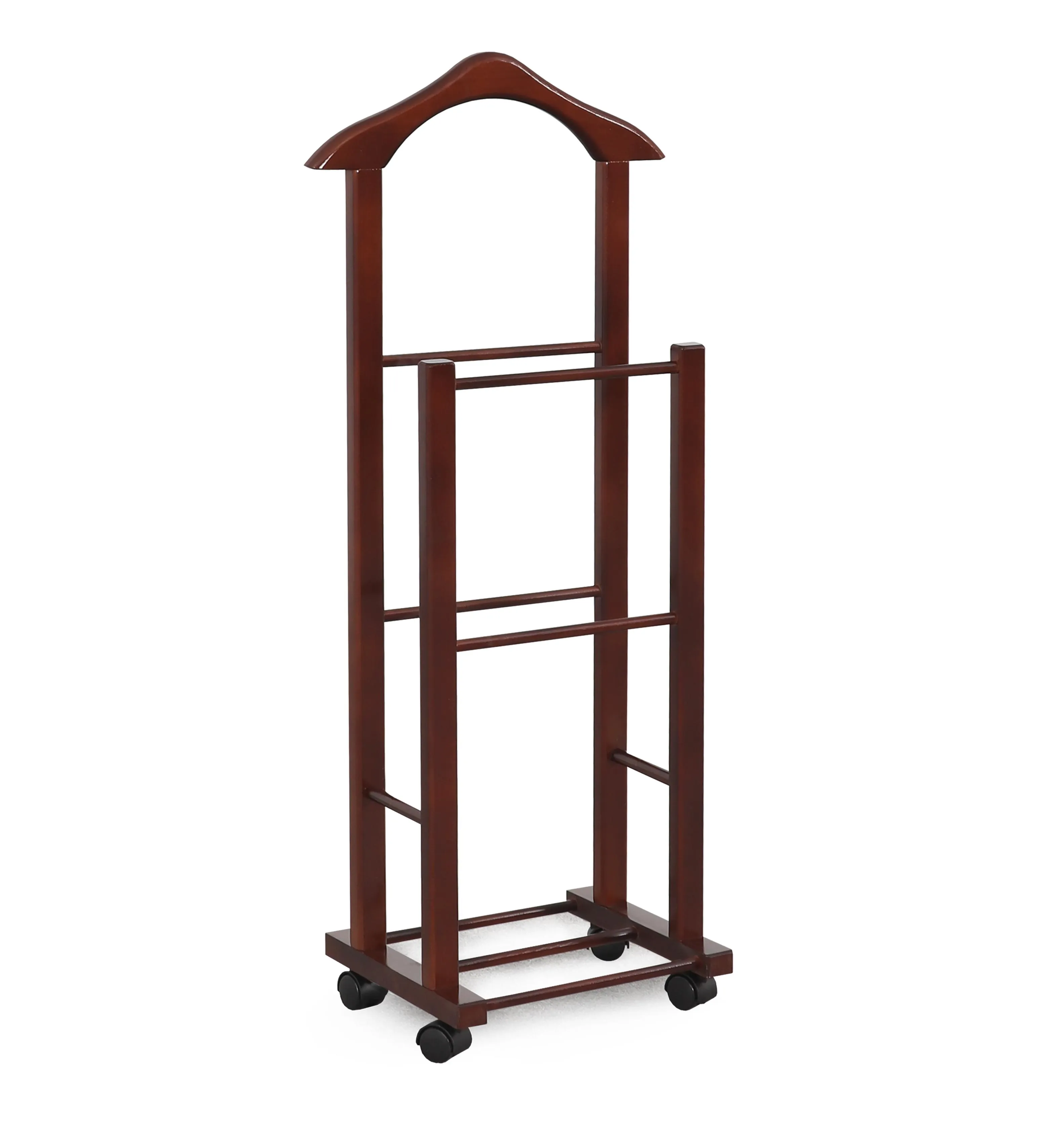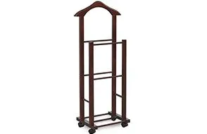 Более высокая стойка высотой почти метр и шириной почти полметра имеет закруглённую верхнюю планку. Такая форма удобна для навешивания одежды с рукавами, а габариты вешалки позволяют размещать наряды даже очень крупных пользователей. На нижней планке удобно расположить брюки и юбки.