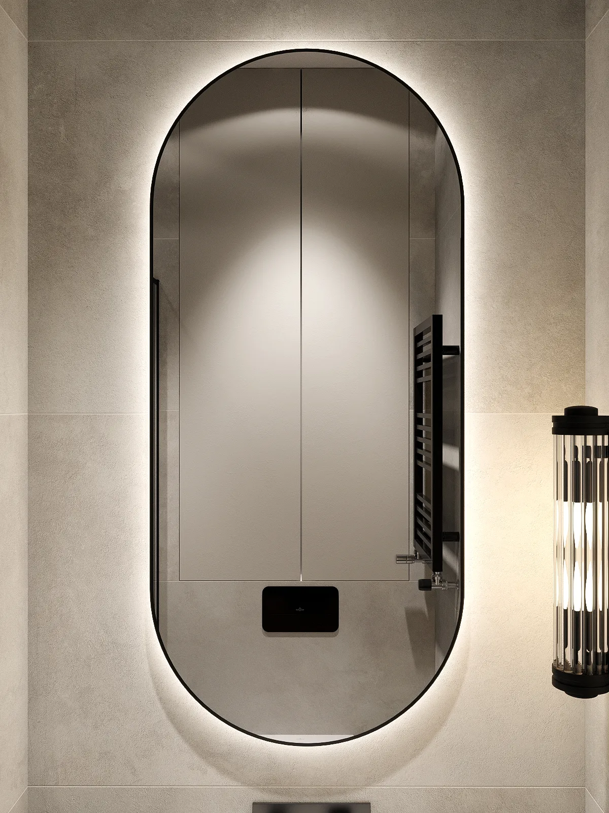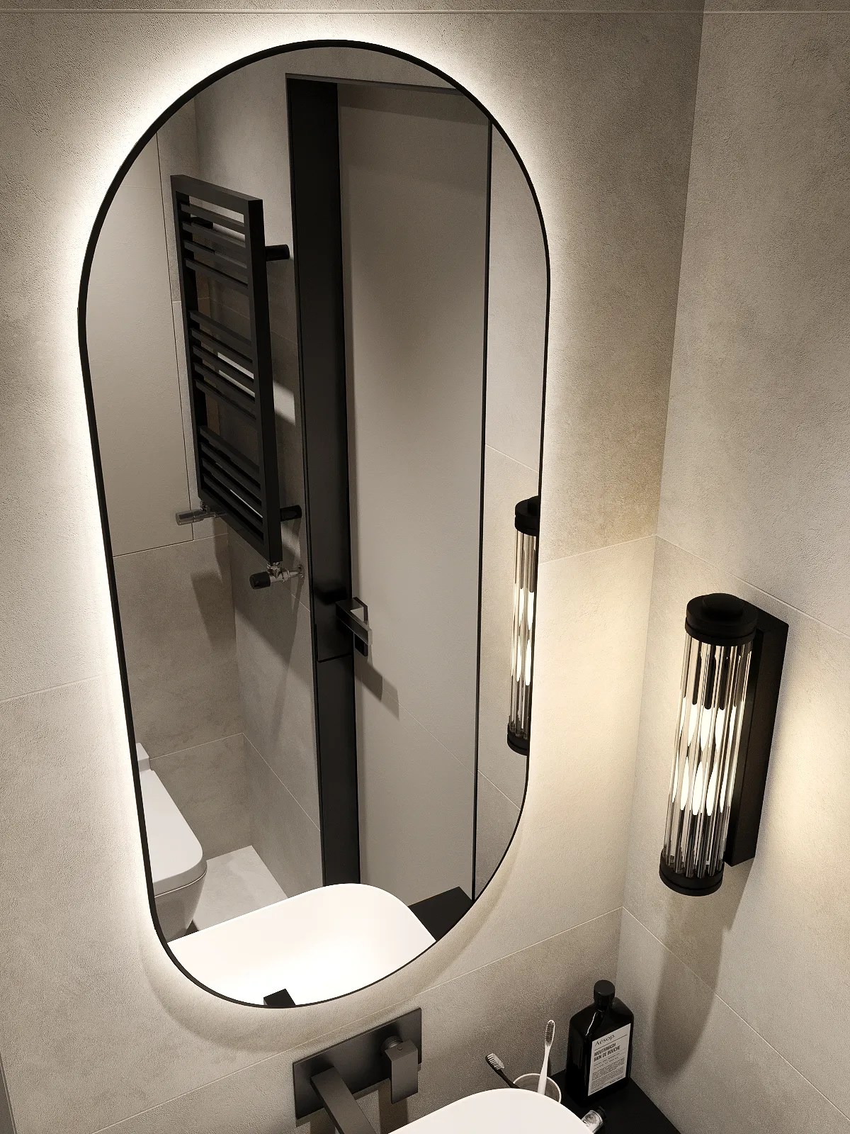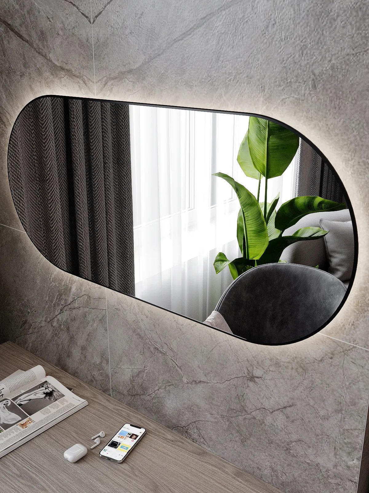 УФ-печать черного контура. Зеркало оснащено пластинами для крепления к стене и светодиодной лентой с выключателем, срабатывающим от взмаха руки. Упаковка представляет собой сбитый короб, состоящий из ЛДСП и ХДФ (сбитый на скобу). Дюбель-гвоздь приобретается отдельно, исходя из материала стен.